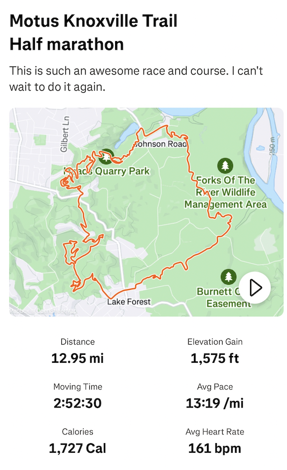 In June I finished the Motus Half which has a similar course but Dirty South is longer and more elevation gain.