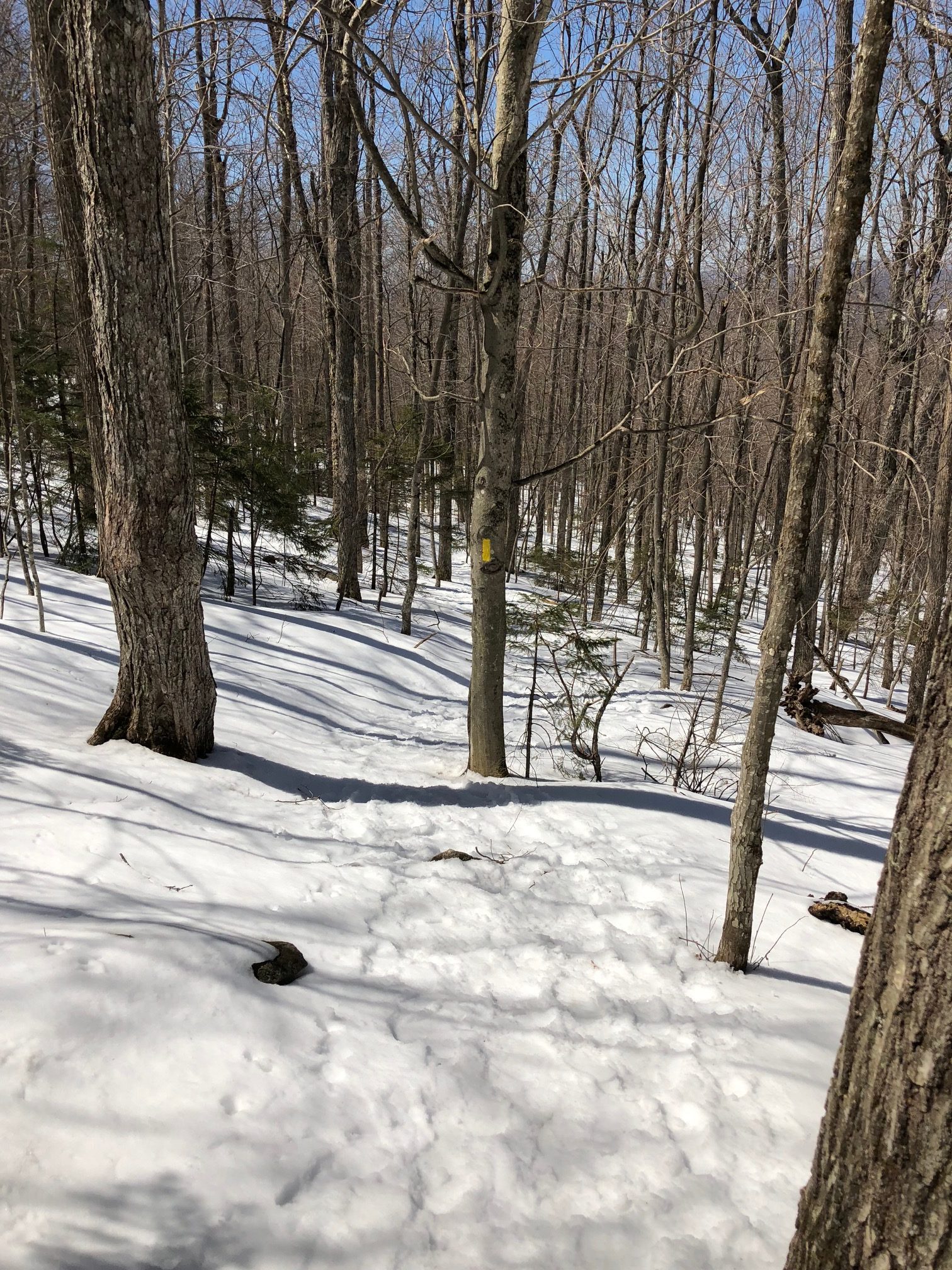 Jeff and I attempted to hike Mount Kearsarge last Saturday, April 21. It was finally a beautiful blue sky day and we arrived at the Winslow State Park trailhead to find over 10 cars lined up outside the gated entrance. The road to the trail was snow packed.